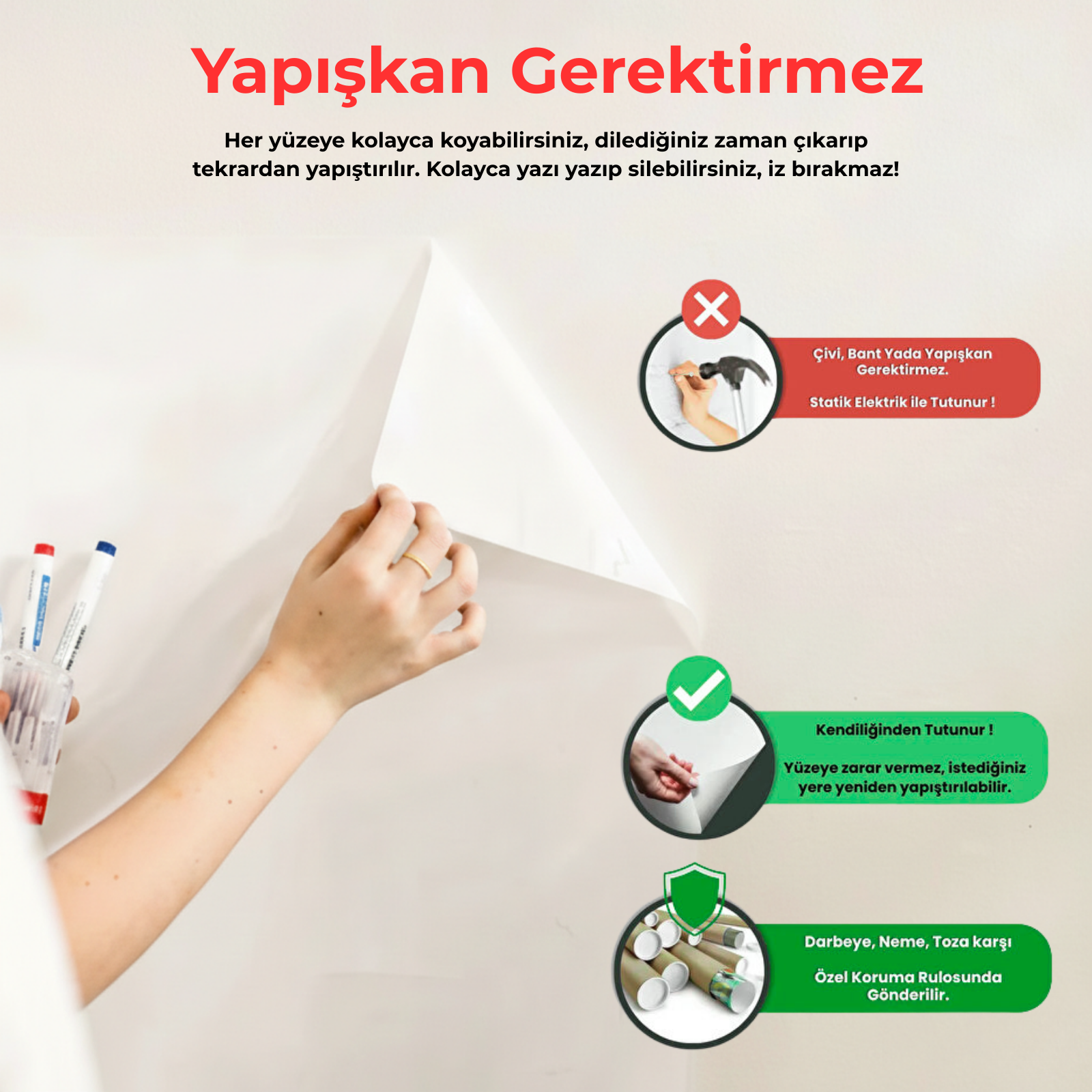 Evet, ürünümüz tamamen elektrostatik enerji ile tutunur. İçeriğinde hiçbir yapıştırıcı kimyasal bulunmaz. Bu sayede duvarınızda iz, leke veya boya kalkması gibi sorunlar yaşatmaz. Kiracılar ve yeni boyanmış evler için mükemmeldir.